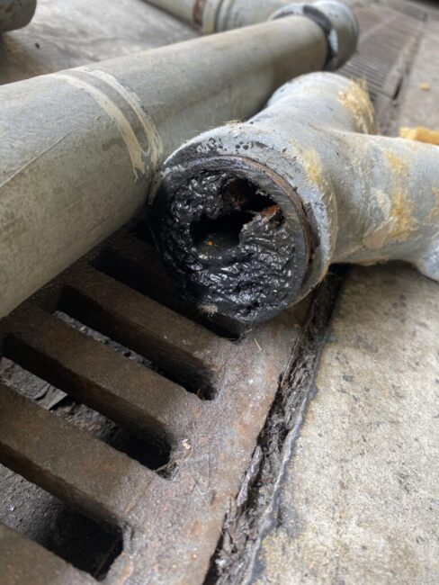古い鉄管の排水管だった為、中が錆びてこんなにも詰まっていました。